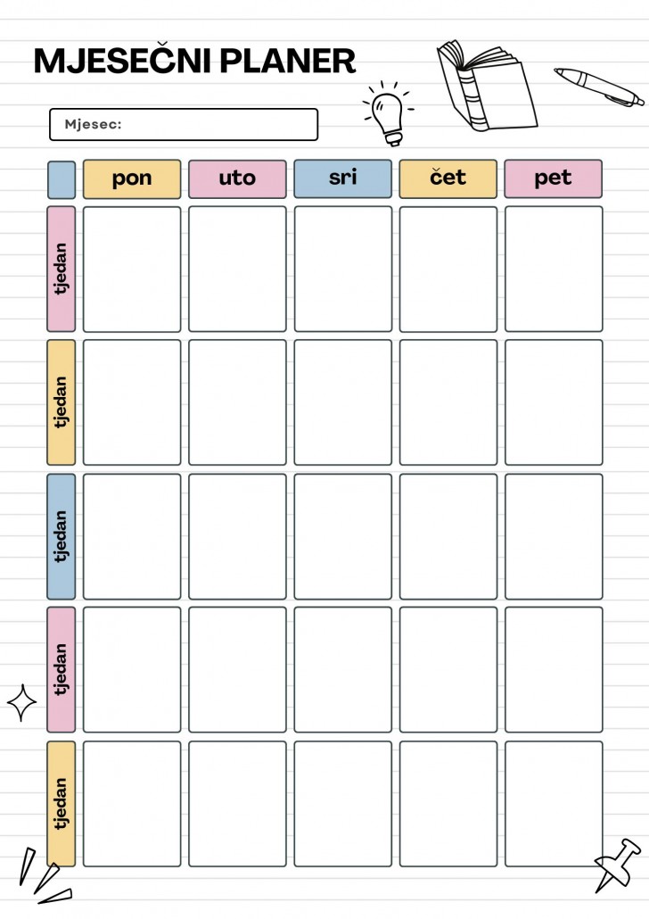 kako bi vam pomogli da što bolje isplanirate sve svoje aktivnosti i obaveze, za vas smo izradili dnevni, tjedni i mjesečni planer. Planeri vam mogu poslužiti kao primjer, a možete ih i sami izraditi u nekoj od aplikacija kao što je na primjer Canava.