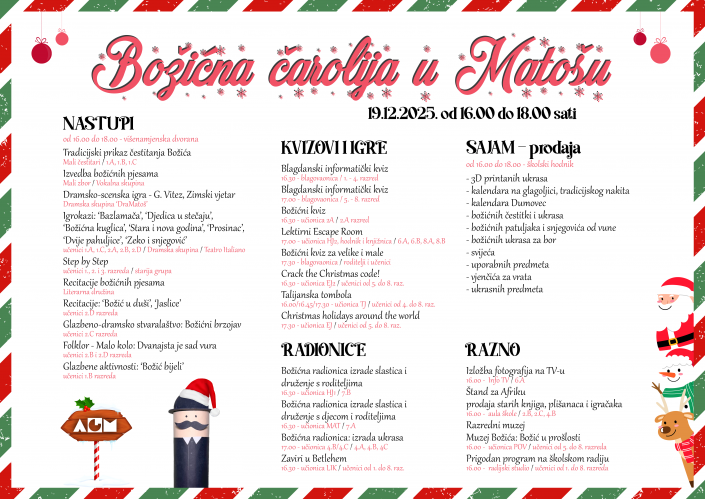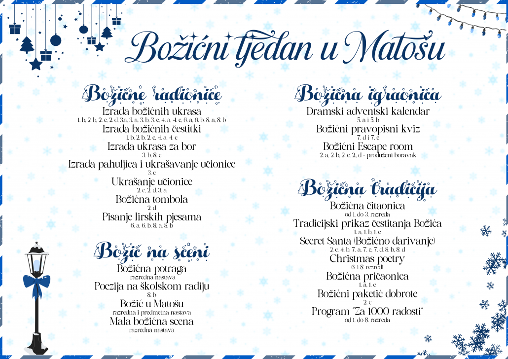 U sklopu Božićnog tjedna u OŠ Antuna Gustava Matoša, u školi će se tijekom tjedna održavati brojne božićne aktivnosti: radionice, igraonice, nastupi, kreativne aktivnosti i njegovanje božićne tradicije.